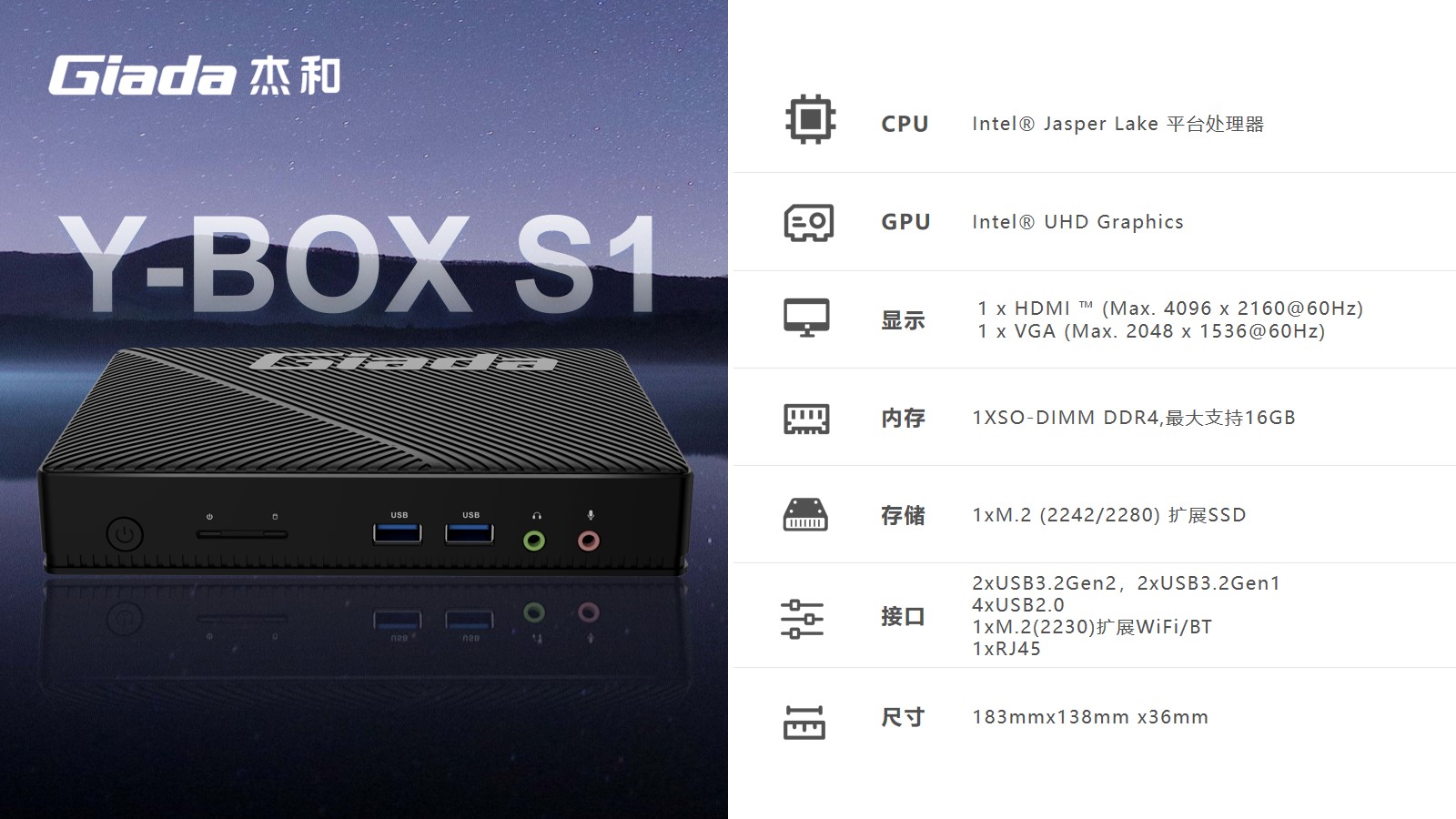 Y-BOX S2处理器平台为Alder Lake-N,是英特尔首款采用7纳米制程的产品系列。采用主流的DDR4内存,支持 M.2和eMMC多存储设备可选,M.2支持PCIE X2和SATA SSD,可满足客户对高数据读写的需求,最大支持32GB;具备一个HDMI接口和一个VGA接口,可以连接到显示器、电视及投影仪,HDMI接口支持最高分辨率为4096 x 2160@60Hz,VGA接口支持最高分辨率为2048 x 1536@60Hz。