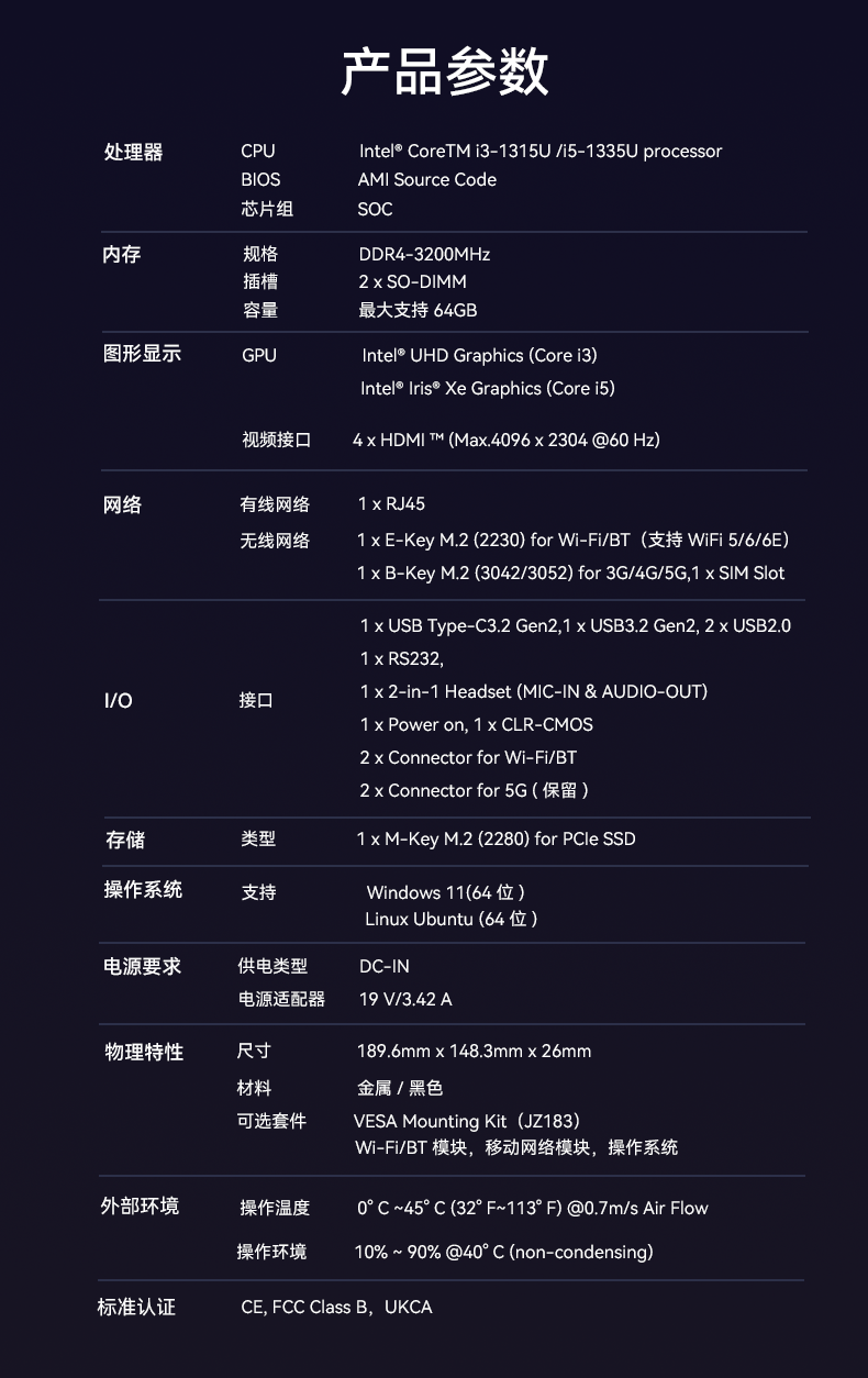米兰科技D613采用英特尔Raptor Lake酷睿i3-1315U/i5-1335U 处理器,作为一款性能强悍的主机,它的TDP仅15W,能有效降低能耗,延长电池寿命。在内存方面,D613采用2 x SO-DIMM DDR4-3200 MHz,最大可达64GB,并配备1 x M-Key M.2 (2280) for PCIe SSD。