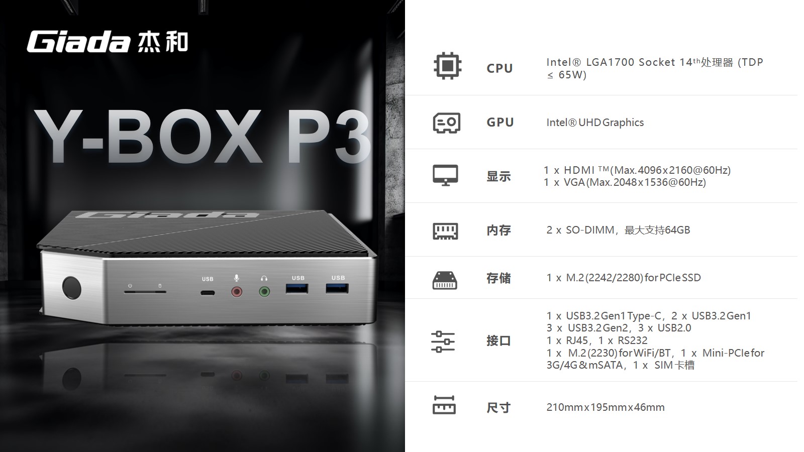 支持指纹解锁,支持type-c接口,支持PD协议的27W快充。米兰科技最新云终端Y-BOX P3采用Intel® LGA 1700 Socket CPU插槽设计,支持intel 12~14代酷睿系列处理器,配备i7-14700处理器,20核28线程,最大睿频频率为5.4GHz,处理器基础功耗 65W。采用双通道笔记本内存槽设计,最大支持容量可达64GB,最高支持DDR5-5600MHz频率,比 DDR4 至高标准数据速度 3200MT/S多传输 1.75 倍。