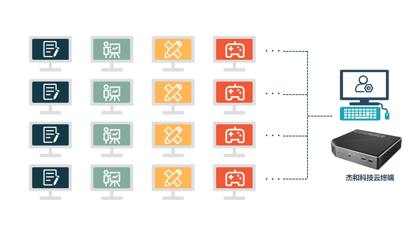 在大学实训室,教师可以通过集中的管理系统快速部署教学软件和资料到所有云终端,确保每个学生都能在同一环境中学习;在企业系统,1名IT人员1小时内可同时安装部署1000台云电脑、预装100个应用;在金融与医疗机构,维护人员可以利用桌面平台实现安全管控、运维管理和资产统计。
