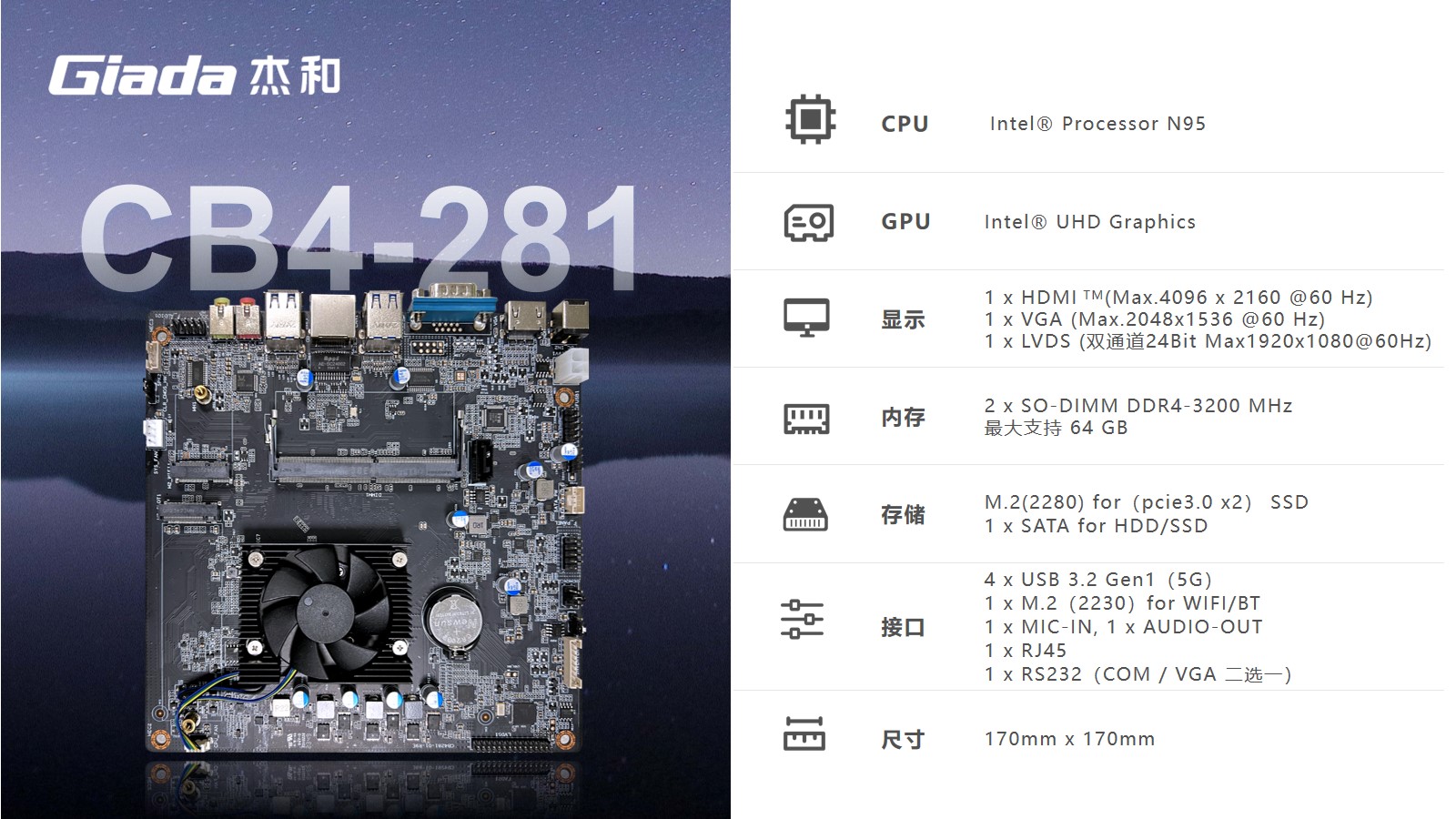 CB4-281支持1 x DDR4 SO-DIMM内存槽,最大支持到32GB,为用户提供了充足的内存扩展空间,以满足多任务处理和内存密集型应用的需求,并且确保多种内存和存储设备的兼容性,为用户提供了灵活的硬件选择和升级路径存储功能,支持M.2(2280) for(pcie3.0 x 2) SSD,1 x SATA for HDD/SSD。