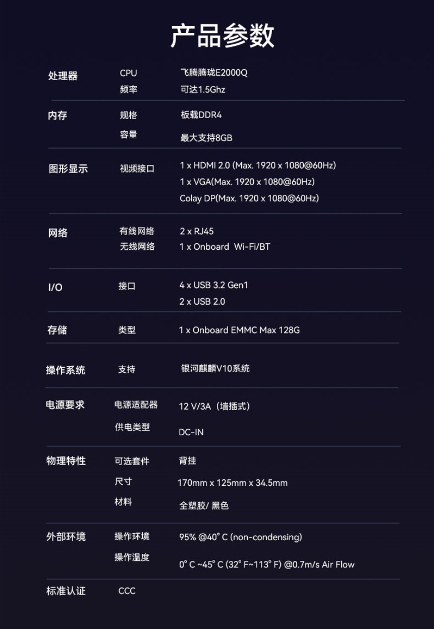 能耗优化:11W超低功耗设计,相比传统PC降低90%能耗,助力绿色办公