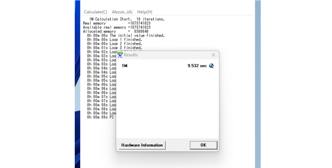 为了评估 CPU 的性能,我们使用了Super PI 1.1 进行了测试,软件以用时为参考成绩,花费时间越短代表计算性能越强。在本次测试中,Core i5-13400 处理器用时 9.532 秒完成了计算,属于当前中端处理器的主流水平,足以应对日常编码、分析和轻量建模任务。