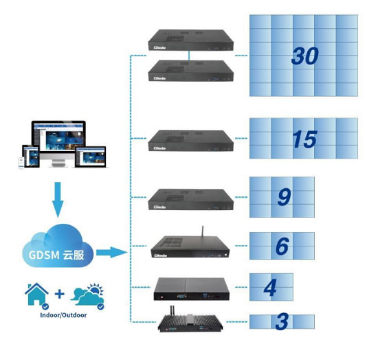 与常规分屏展示方案不同,在米兰拼接控制器的视频输出能力和GDSM系统分组设置能力的组合下,店铺可以随时调整的拼接放置样式;快速设置屏幕的拼接、分组方式;快速编辑制作并发布信息;是一套安装部署迅速、内容调整迅速、更新反馈迅速的一体化信息发布方案。
