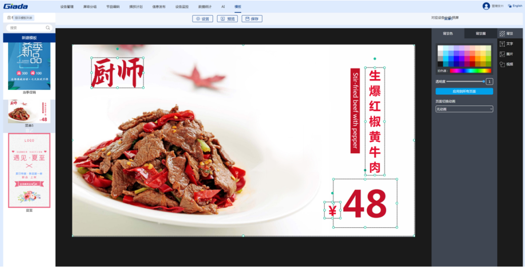 米兰科技智慧餐厅综合解决方案是由智能零售管理系统搭载公司自研的数字标牌播放器组成的软硬件一体化方案。该系统针对餐厅、酒店等不同行业提供典型节目模板,支持手机、电脑建议操作。用户只需3步即可完成节目的制作播放:选择节目模板,更换自己的素材(视频、图片和文字),预览保存及播放。价格、优惠折扣等信息可随时更改。
