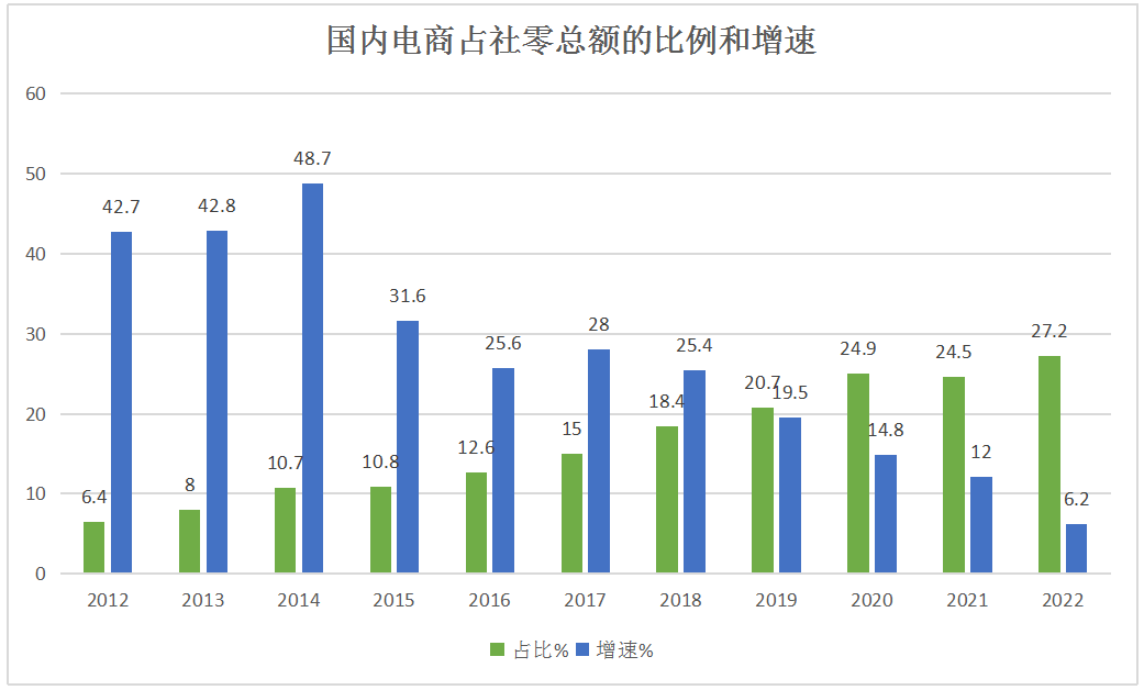 虽然打赌之初,业内的专业人士就不认为电商的占比会超过社零总额的50%,但还是要看数据说话。2023年初,据国家统计局数据显示,2022年中国社会消费品零售总额达到43.97万亿元,这其中实物商品网上零售额增长6.2%达到历史性的11.96万亿元,已经占到整体社会消费品零售总额的27.2%,不过距离50%这一目标,依然相当遥远。▼