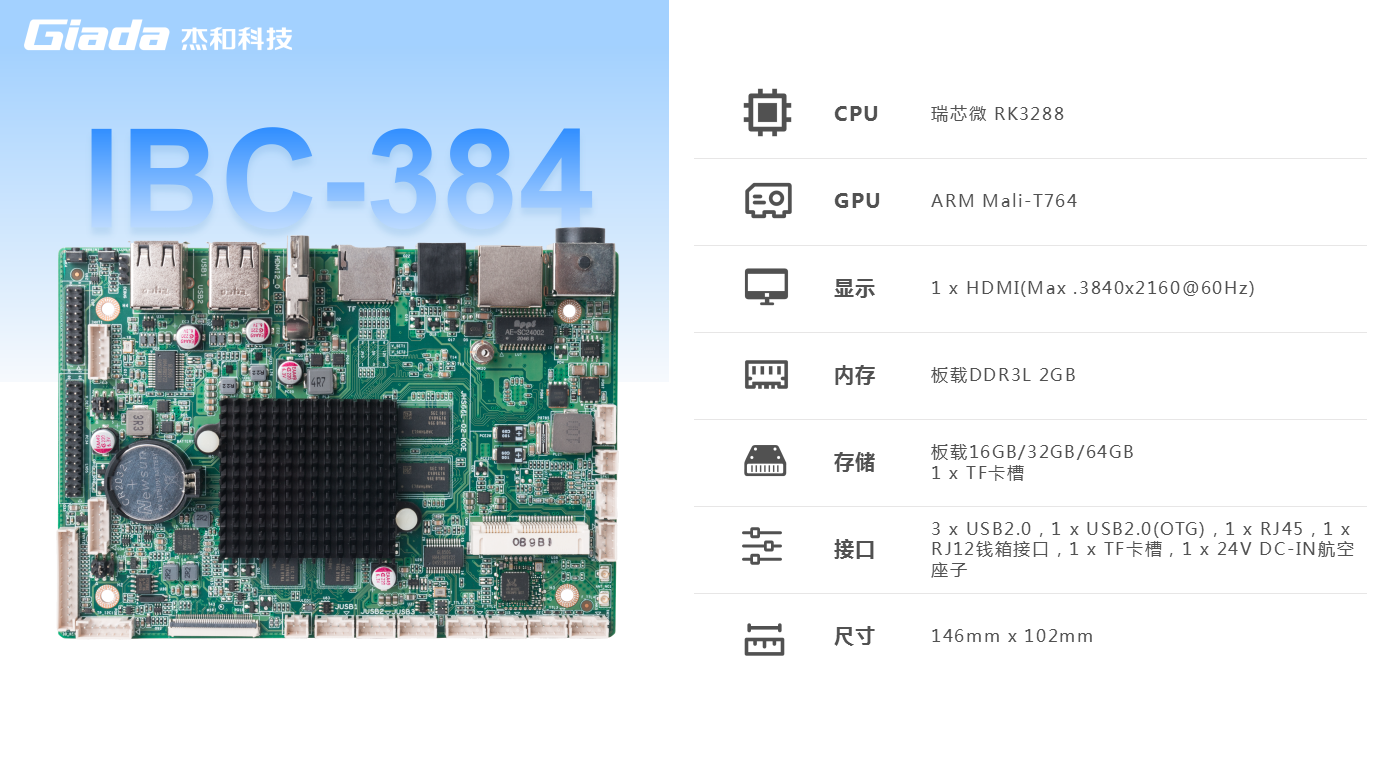 杰和IBC-384嵌入式主板是专为零售收银设备设计的高性能主板,具备 1X24V 前空接头 DC-IN 和 RJ12钱箱接口,它提供可的电源供应和便捷的钱箱连接,适用于各种收银系统的应用场景,同时具备优异的处理能力和稳定性。
