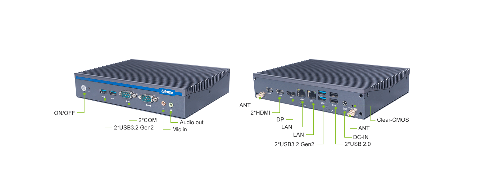 米兰科技AE613支持Windows 11 (64bit) /Linux Ubuntu (64bit)系统,双千兆自适应RJ45网口,4 x USB3.1 (10 Gbps),2 x USB2.0,1 x RS232,,1 x RS232/422/485,1 x MIC-IN,1 x AUDIO-OUT,丰富的I/O功能接口,实现更多功能扩展。