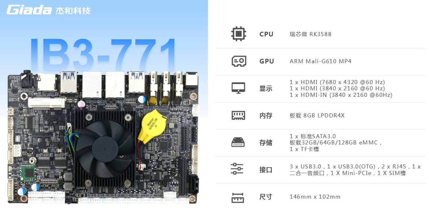 米兰科技IB3-771的处理器瑞芯微RK3588,搭载四核A76+四核A55的八核CPU,可以提供强大的运算能力和实时性能,从而支持高级路径规划和碰撞检测算法,有助于机器人规避障碍物、规划最优路径和执行复杂的任务。