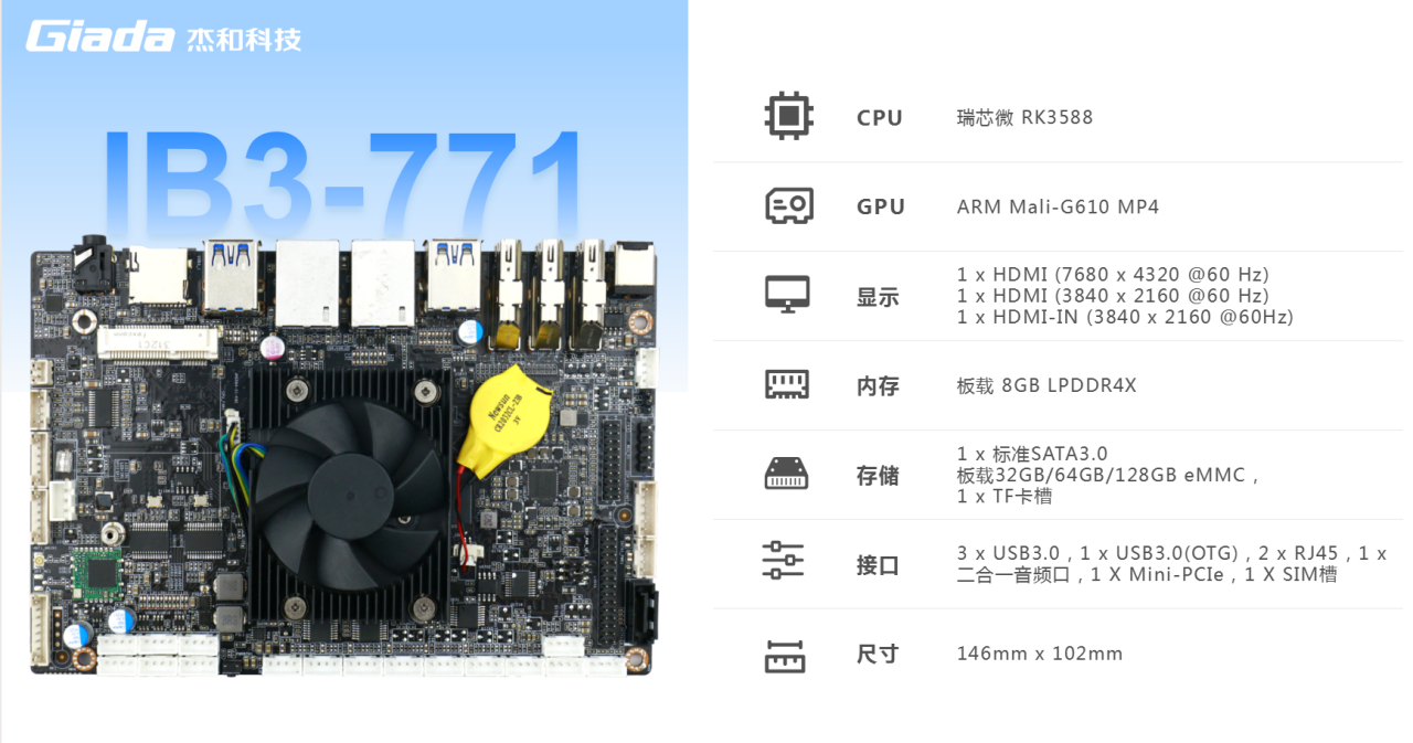 米兰主板IB3-771搭载瑞芯微RK3588八核64位处理器,内置6TOPS算力的NPU,具备高算力、内存大、超强多媒体、多重扩展等技术优势。满足8k超高清视频的显示需求,还支持主流深度学习框架,为各类 AIOT 应用场景提供更优的性能表现,支持机器人、边缘计算、智能NVR、智能汽车、智慧大屏、AR/VR、智能自助终端场景的广泛应用。