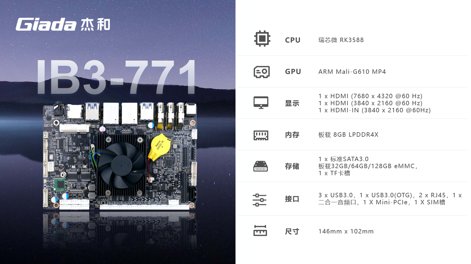 处理器RK3588搭载四核A76+四核A55的八核CPU和ARM G610 MP4 GPU
