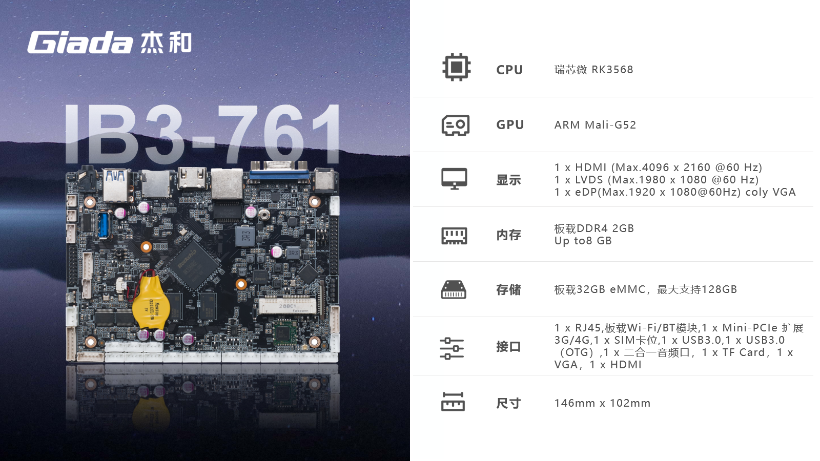 米兰ARM主板IB3-761基于瑞芯微RK3568四核64位处理器开发,可实现多任务并行、更大数据集的高效处理,丰富的接口,具有性能强、内存大、集成度高、扩展能力强等特点,在处理速度和图形处理能力方面都表现出色,可广泛应用于物联网网关、边缘存储、工控平板、工业检测、工控盒、自助终端、云终端、车载中控、机器人等行业定制市场。