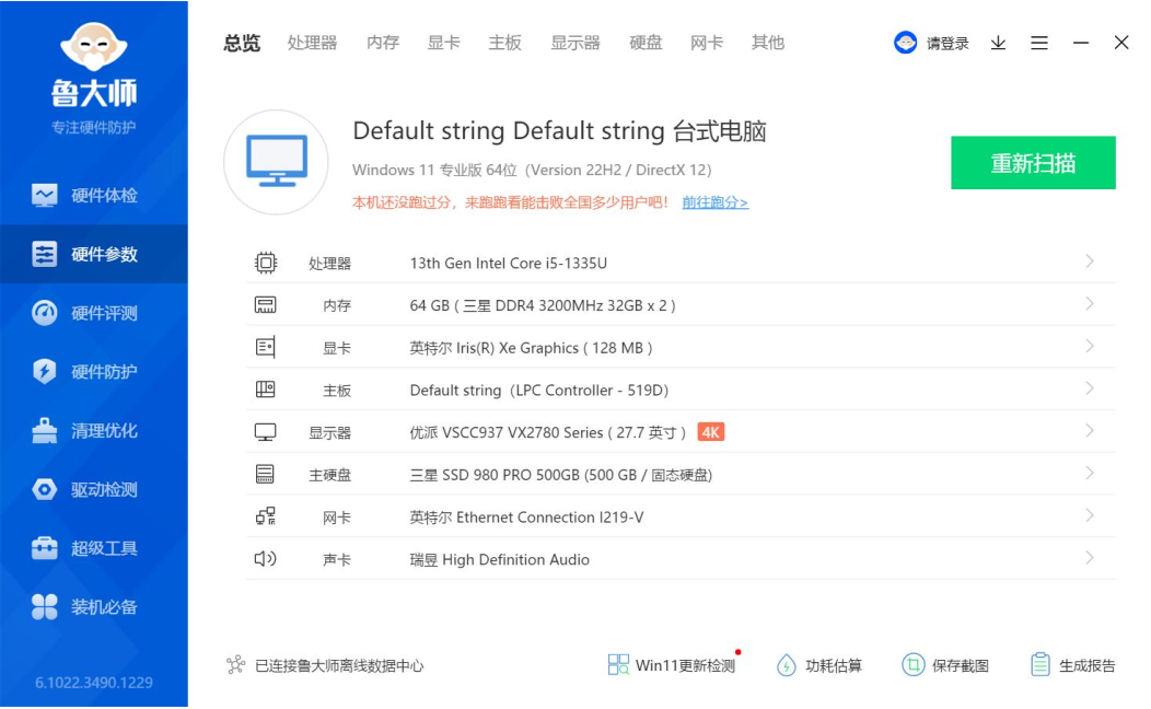 上面是鲁大师识别的米兰AE613硬件参数详情,我们进行跑分测试的核心三大件选择的是13th Gen Intel(R) Core(TM) i5-1335U @1.30GHz处理器,Intel(R) Iris(R) Xe Graphics显卡,三星 32GB*2 DDR4 3200MHz内存,三星SSD 980 PRO 500GB(500 GB/固志硬盘),下面我们来看详细的跑分数据。
