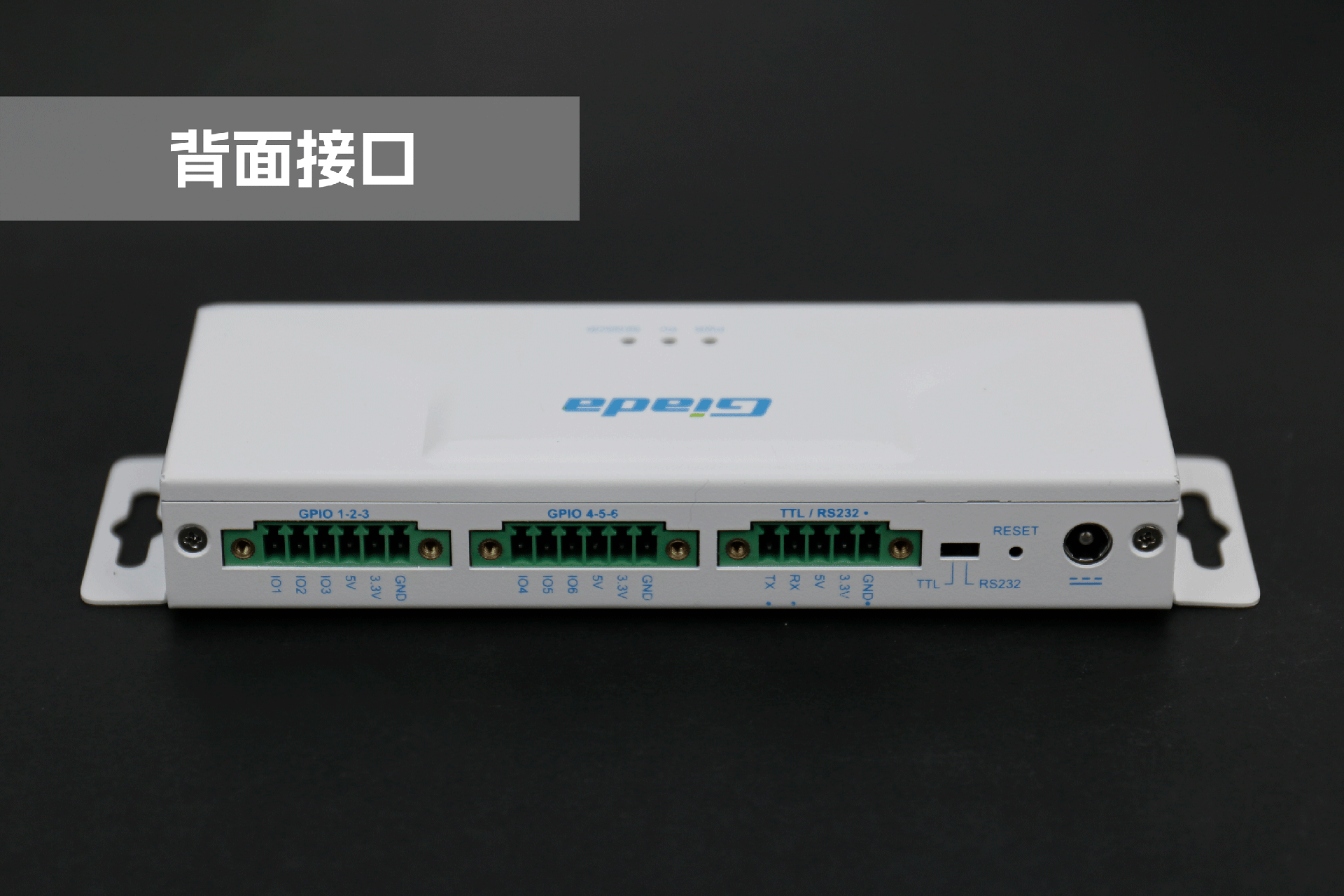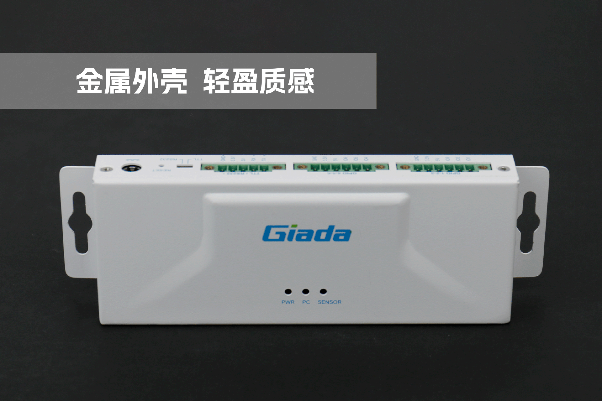 米兰物联网拓展坞RD01外部为白色,顶部印制米兰Giada的彩色logo,外壳采用金属材质,左右两侧设计同材质挂耳,可以方便用户固定设备。