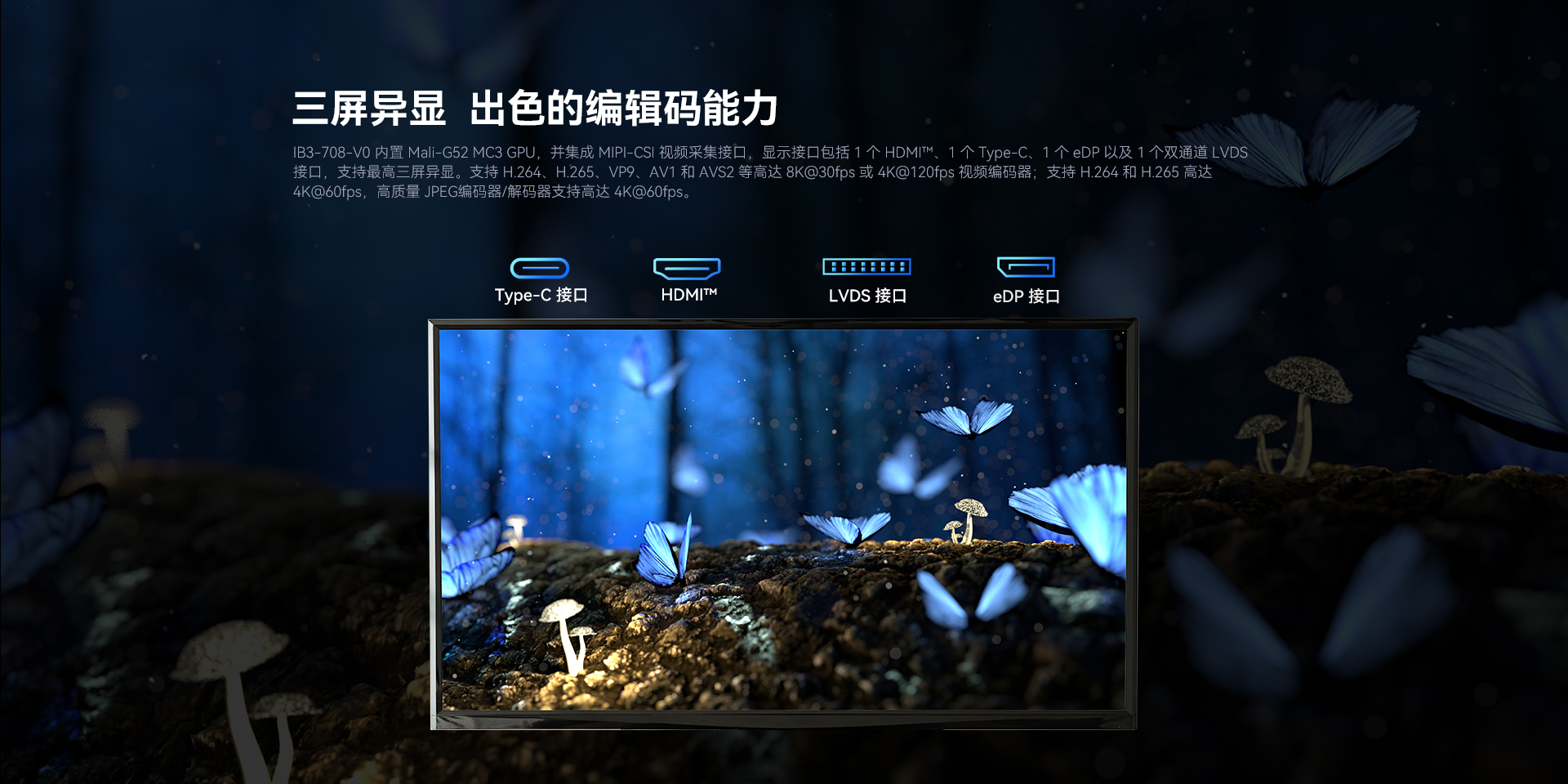 | 视频输出 | 1 x HDMI™(Max. 3840x2160@120Hz) 1 x Type-c (Max. 3840x2160@120Hz) 1 x eDP (Max. 3840x2160@60Hz) 1 x LVDS (Max.1920x1080@60Hz) | |